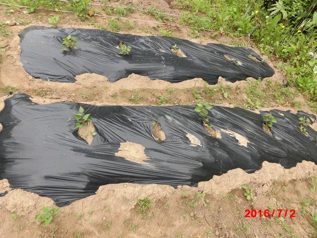 - 5月30日 ビニールマルチをすると同時になす(黒べえ)を植える。ビニールマルチをすると同時薩摩芋(紅東)を植える